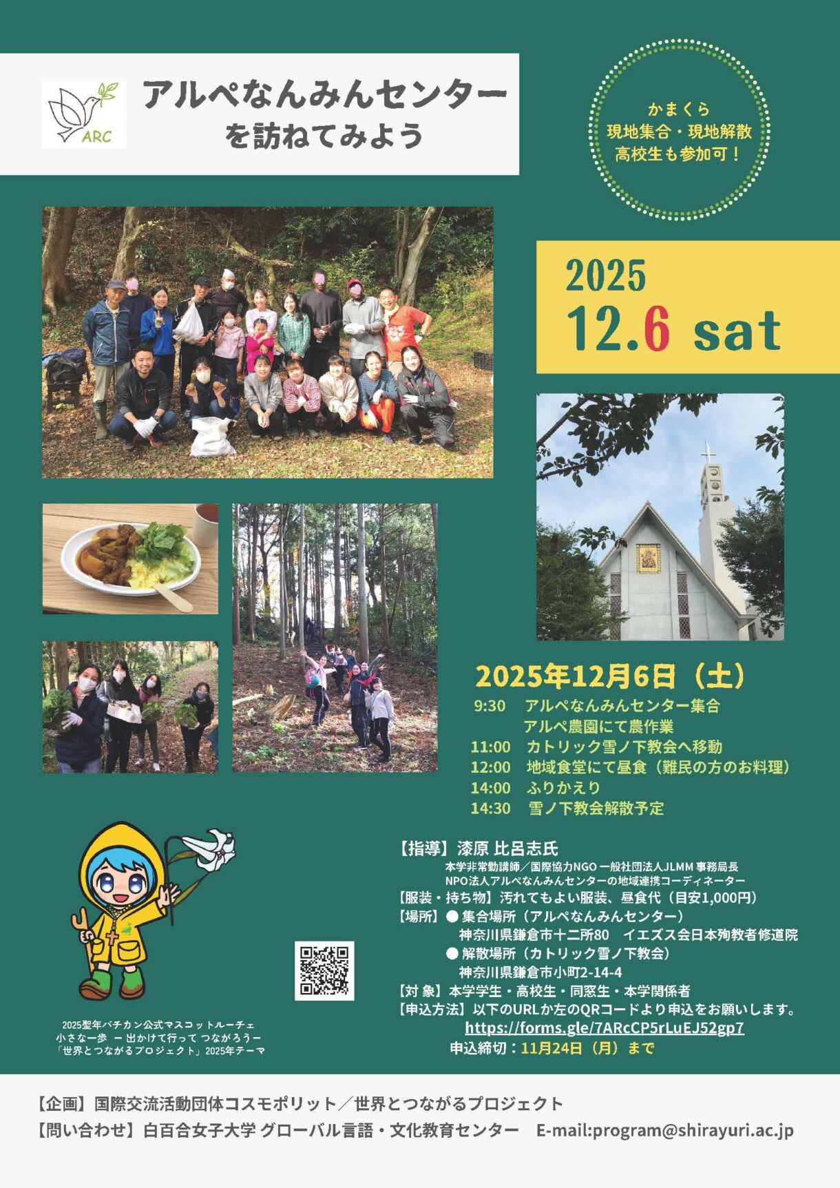 当日は、漆原 比呂志氏(本学非常勤講師/国際協力NGO 一般社団法人JLMM 事務局長/NPO法人アルぺなんみんセンターの地域連携コーディネーター)ご指導の下、アルペ農園にて野菜の収穫を行い、お昼はカトリック雪ノ下教会で行われる地域食堂にて難民の方が作ってくださったスリランカ・カレーをいただきます。その後、同氏より国内の難民の方々の現状やセンターの活動、そして入居中の難民の方々の様子を伺いながら、1日の振り返りを行う予定です。当フィールドワークは2023年からの取り組みで今回で3回目となります。